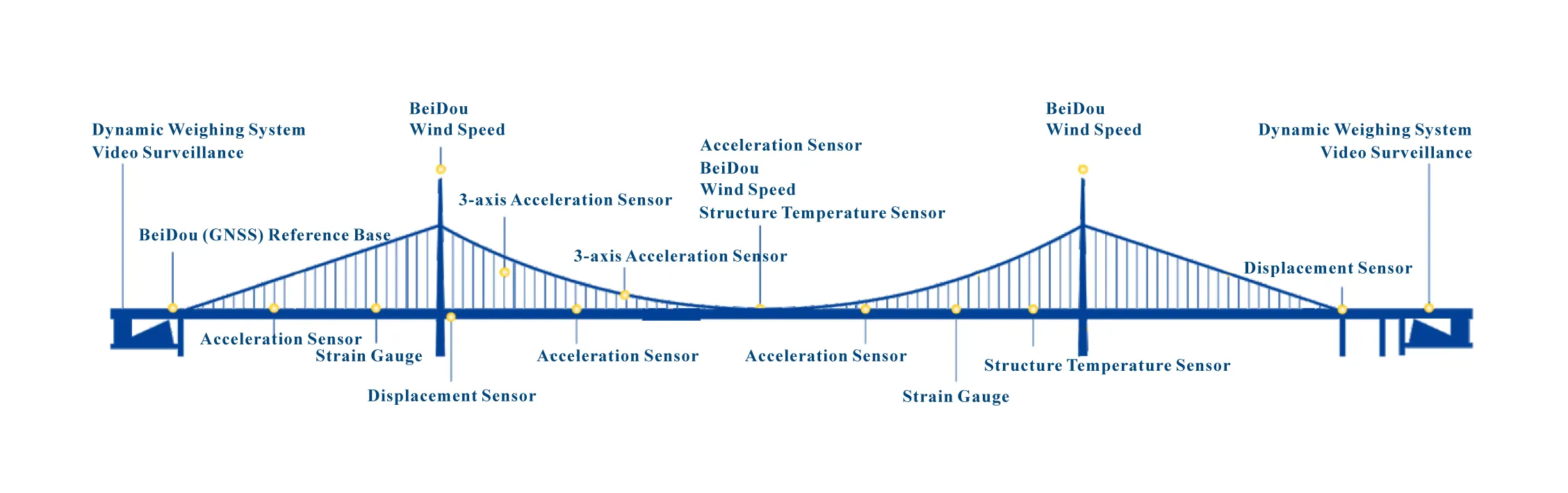Путем размещения различных датчиков, устройств сбора данных и оборудования передачи на конструкциях моста проводятся долгосрочные автоматические измерения воздействия нагрузки на мост, воздействия окружающей среды и реакций конструкции. Измеренные данные передаются на облачную платформу через проводные или беспроводные технологии связи, предоставляя клиентам такие услуги, как удаленный мониторинг конструкции моста, раннее онлайн-предупреждение, оценка состояния и поддержка принятия решений.